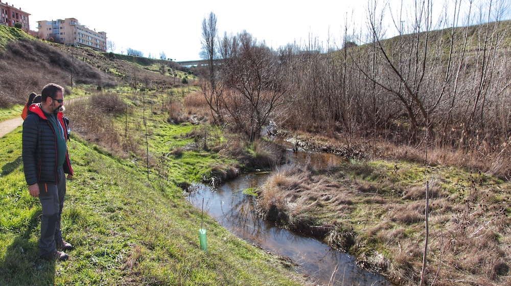 La presa del molino hace de barrera para el sedimento, que queda atrapado aguas arriba. En consecuencia el cauce del río Arevalillo se estrecha y es ocupado por la vegetación. Foto: Gabriel Castilla.