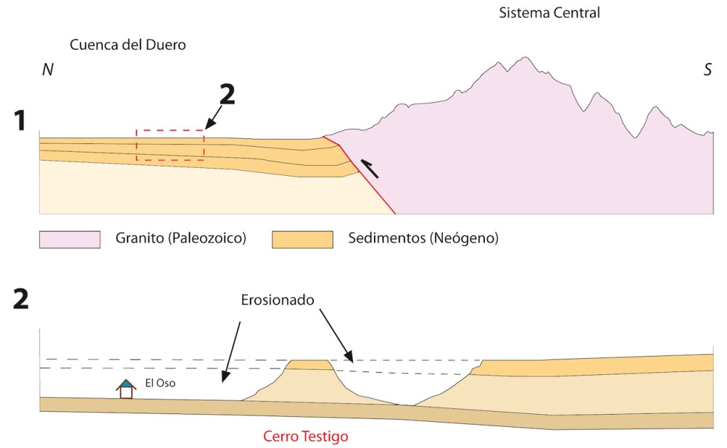 Esta erosión incipiente deja esparcidos pequeños cerros de suaves laderas y cimas planas que son los únicos testigos que quedan de unos sedimentos que han sido erosionados. A estas formas se las denomina cerros testigos en geología. La parte más alta de estos cerros está ocupada por capas sedimentarias más resistentes a la erosión y los protegen de ser completamente desmantelados.